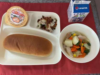 12月12日(木)の給食は、きのこのドリア、鶏肉と野菜のスープ煮、黒糖パン、みかんゼリー、牛乳です。