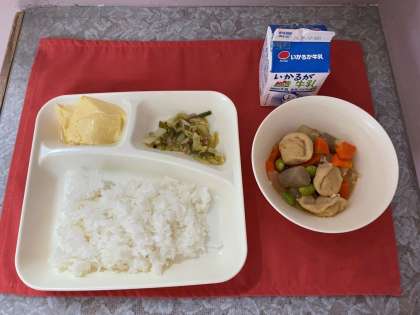12月13日(金)の給食は、一口がんもと野菜の煮物、キャベツとピーマンのそぼろ炒め、卵豆腐、ごはん、牛乳でした。