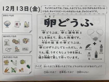 ご覧のように、給食に卵豆腐が出ました。とても美味しかったです。