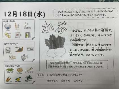 本日の献立は、豚肉と野菜の煮もの、じゃこ豆、かぶのゆず風味、ごはん、牛乳です。
