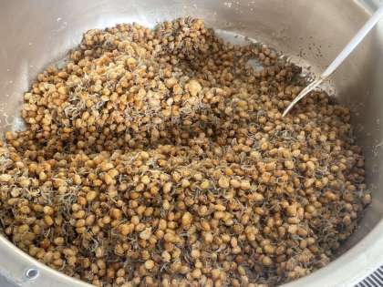 「じゃこ豆」は、ゆでたちりめんじゃこと、でん粉をまぶしてなたね油であげた大豆に、甘辛い調味液をからませます。かみごたえのある、子どもたちに好評な献立です。