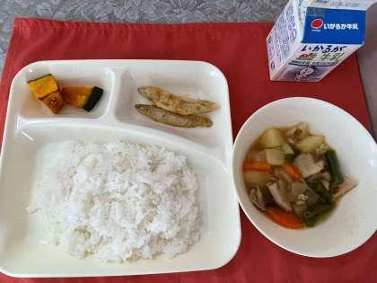 本日の献立は、きびなご天ぷら、含め煮、焼きかぼちゃの甘みつかけ、ごはん、牛乳です。