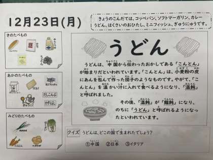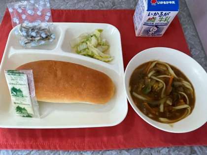 2学期最後の献立は、カレーうどん、白菜のおひたし、コッペパン、ソフトマーガリン、ミニフィッシュ、牛乳です。