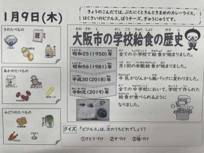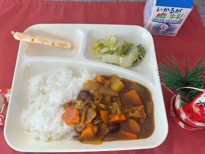 今年最初の給食は、豚肉と金時豆のカレーライス、白菜のピクルス、棒チーズ、牛乳です。