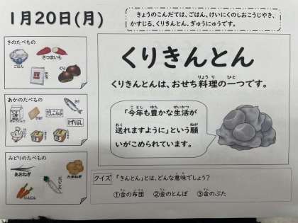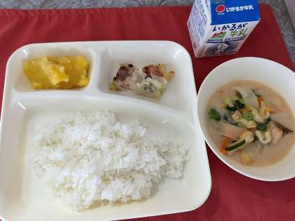 本日の献立は、鶏肉の塩こうじ焼き、かす汁、栗きんとん、ごはん、牛乳です。