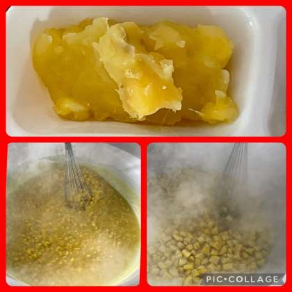 煮くずれるまで、やわらかく煮たサツマイモに、栗を加え、砂糖、みりん、塩で味付けして煮含めています。