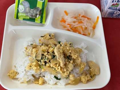 本日の献立は、親子どんぶり、紅白なます、抹茶大豆、牛乳です。