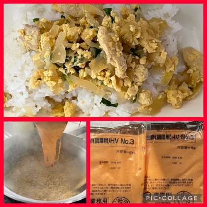 「親子どんぶり」は、鶏肉、玉ねぎ、青ねぎを、甘辛い出汁で煮て、玉子を加え、配食時に、ごはんを盛りつけた上にかけます。