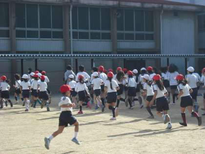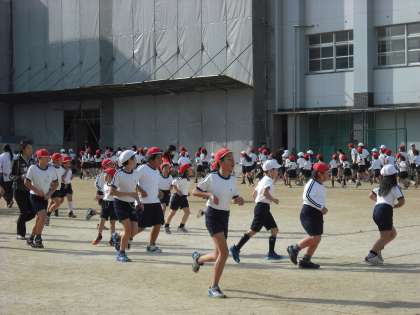 耐寒マラソンがスタートしました。運動場を元気よく走ります。寒さに負けず、全校児童でがんばろう!