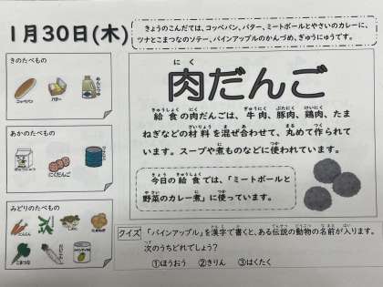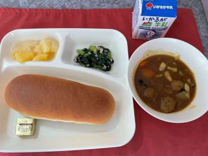 本日の献立は、ミートボールと野菜のカレー煮、ツナと小松菜のソテー、パインアップルの缶詰、コッペパン、バター、牛乳です。