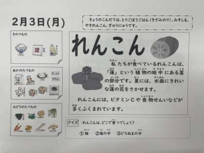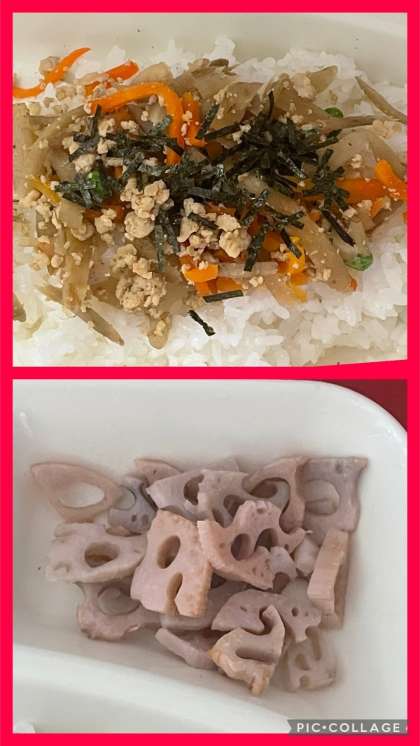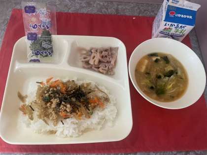 本日の献立は、鶏ごぼうごはん(きざみ海苔)、みそ汁、焼きれんこん、ごはん、牛乳です。