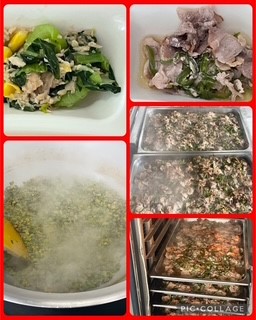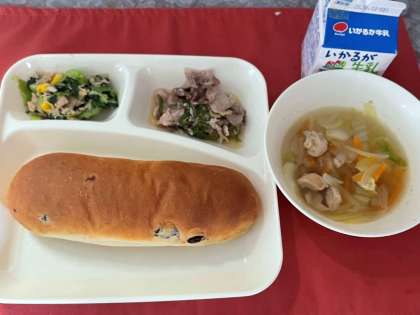 本日の献立は、豚肉のオイスターソース焼き、中華スープ、ツナとチンゲン菜の炒め物、レーズンパン、牛乳です。