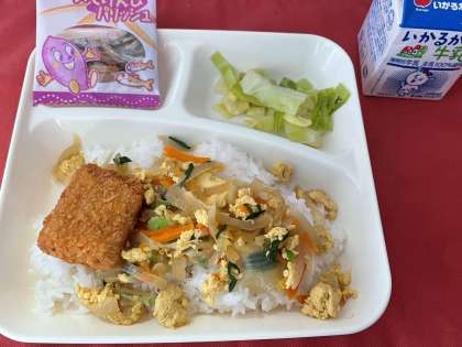 本日の献立は、かつ丼(かつ、具)、キャベツの梅風味、芋けんぴフィッシュ、牛乳です。