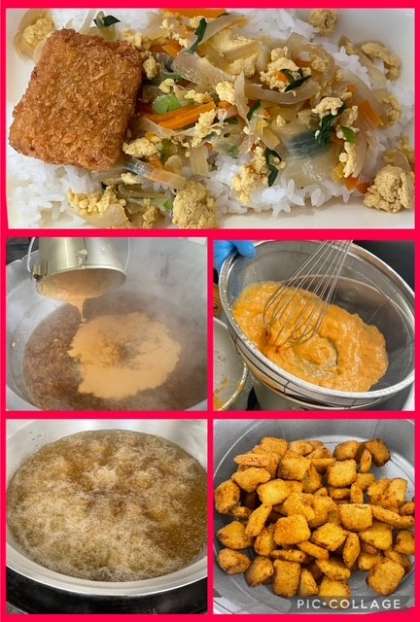 配食時に、かつ丼の具を、ごはんの上にかけてから、カツをのせています。