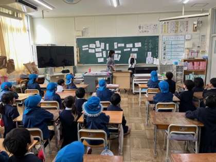 1年2組の授業の様子を見ていただいたのち、1組では一緒に座って授業に参加していただきました。