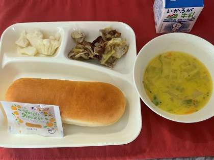 本日の献立は、豚肉のカレー風味焼き、コーンスープ、カリフラワーのピクルス、コッペパン、アピリコットジャム、牛乳です。