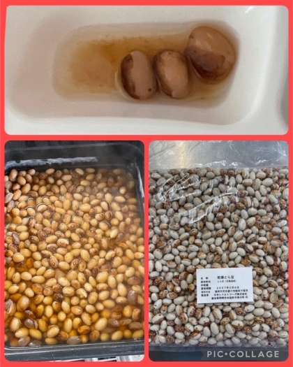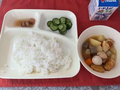 本日の献立は、関東煮、きゅうりの梅風味、とら豆の煮もの、ごはん、牛乳です。