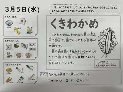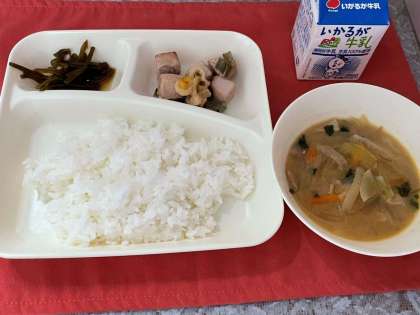 本日の献立は、まぐろの甘から焼き、豚汁、茎わかめの佃煮、ごはん、牛乳です。