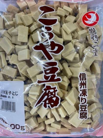 「高野豆腐の煮物」は、ご覧の高野豆腐(カット)を、砂糖、みりん、薄口しょうゆで味付けした出汁で、煮含めています。彩りにむき枝豆を使用しています。