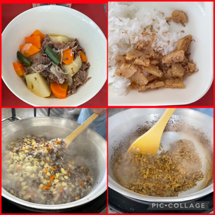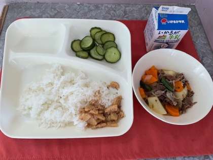 「ごまかかいため」は旬のたけのこにかつおぶし・いりごまをいためみりん・しょうゆで味付けしています。ごはんに合う1品でした。肉じゃがも児童に好評な定番の煮物でした。ほとんどの学級では完食していました。