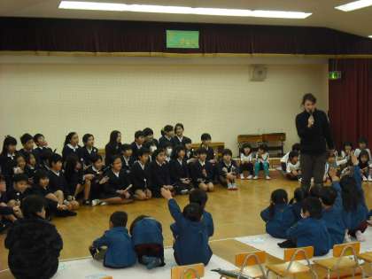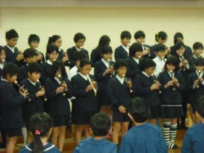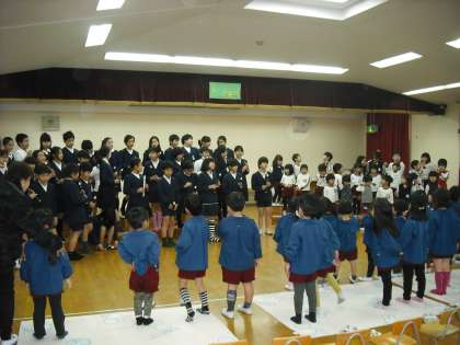 玉出小学校の5年生が玉出幼稚園に行きました。青組さんの音楽発表会を見ました。とても一生懸命やっていたので、玉小コンサートもがんばらないとと思った5年生でした。リコーダーで「やまびこさん」を演奏し、幼稚園の園児が歌い、とても楽しいひとときでした。