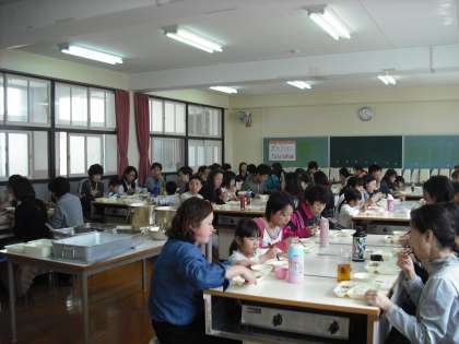 テーブルごとに地域の方々、教職員も入り、楽しくお話をしながら食べることができました。