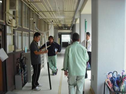 5月11日、不審者が入ってきたという想定で避難訓練を行いました。今年度から、避難訓練の日は決まっていますが、いつの時間に行うのかは、校長先生が決めます。だから、いつ放送が入るのかわかりません。少し緊張しましたが、10時10分に「今から避難訓練を始めます」と放送がありました。そして教頭先生が「緊急放送、緊急放送」と言い、シャッターを閉めたり、さすまたをもってかけつけたりしました。