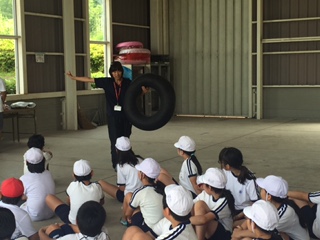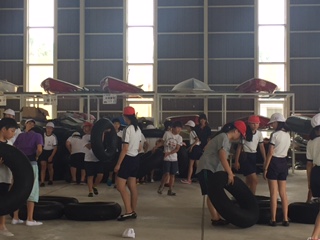 1日目午後のプログラム、イカダ作りが始まりました。真剣に話を聞き、協力して作ろうとしています。