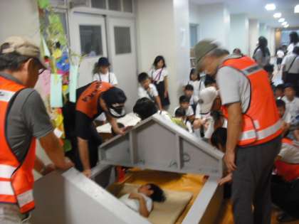 体験学習もたくさんあります。煙体験、ロープ体験、放水体験です。またクイズで楽しく地震の時にどう行動するか学ぶこともできました。