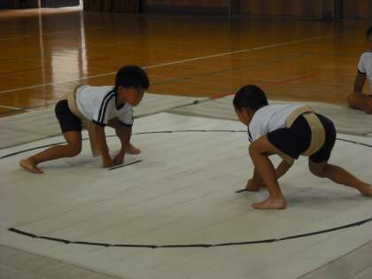相撲は、長居公園内の長居相撲場で行われます。本格的な土俵です。明日に向けて、本番通りに練習をしていました。がんばれ!