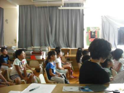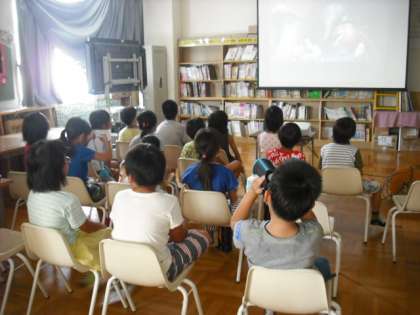 8月16日、映画は、トイストーリーとかいけつゾロリでした。子どもたちはその世界に入りきって楽しんでいました。読み聞かせは「小学生のぼくは、鬼のようなおかあさんにナスビを売らされました。」というお話でした。真剣に聞いている子どもたちでした。