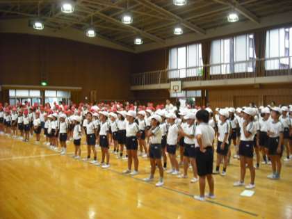 あいにくの雨でした。講堂で、はじめの体操とおわりの体操、応援歌、校歌、大つな引きの歌をしました。応援歌はさすがです。赤も白も一生懸命に歌っていました。