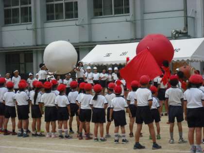 全体での競技である、大玉送りと大綱引きをしました。大玉送りは、全校児童で大きな玉を送っていきます。頭の上を通っていくので、落とさないようにそして早く、全学年のチームワークが勝利のポイントです。