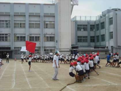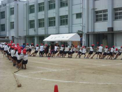 大綱引きは、1年生から3年生の歌に合わせて、4年生から6年生が入場し、xに置かれた綱を引き合います。玉出小学校ならではの種目です。さあ、今年の運動会は赤と白、どちらが勝つのでしょうか?