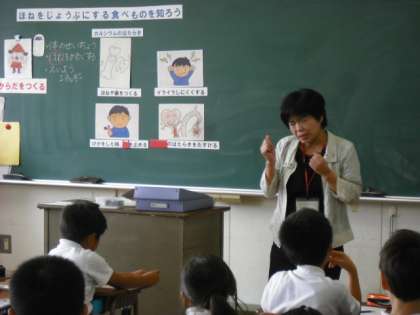 「骨をじょうぶにしよう」というテーマで必要な食材について、ビンゴゲームで学習しました。カルシウムを含む食材を食べたら、イライラすることが減ったり、血が止まりやすくなったりすることを学びました。具体的な食材として牛乳があります。牛乳が毎日給食で出されることの大切さがわかりました。ほかにも小魚や色の濃い野菜にもふくまれているということでした。