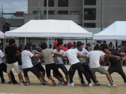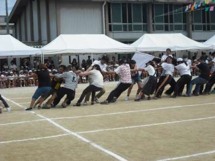 大人も負けていません。「勝利の手にタッチ」では、綱引きで大いに盛り上がりました。卒業生もたくさん参加してくれ、紅組の勝利でした。