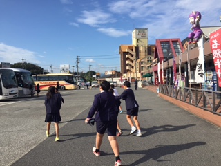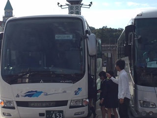 伊賀上野ドライブインで休憩をしました。全員元気です。バスの中で歌っています。