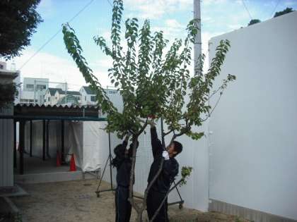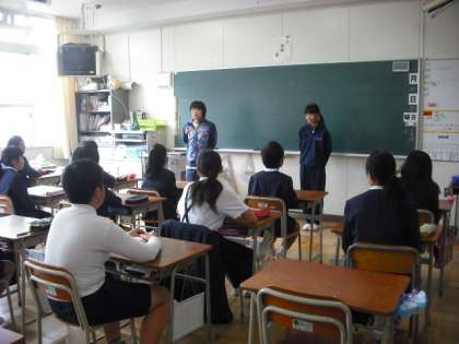 玉出中学校から2年生2名が、玉出小学校に職場体験に来ました。最初に児童集会であいさつをしました。きちんとした態度でとても素晴らしかったです。その後は管理作業員さん体験として木を切るお手伝いをしたり、小学校の先生体験として授業に入ったりしました。
