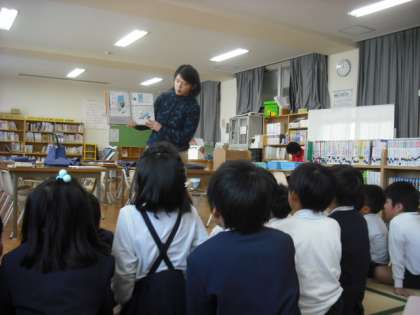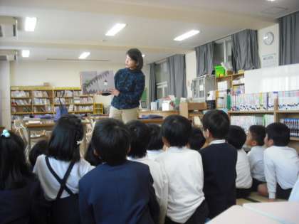 毎週木曜日は、図書支援員の西本さんが来てくださっています。貸し出しを手伝っていただいたり、昼の図書館開放や授業中に読み聞かせをしてくださったりしています。今日は2年生の絵本を三冊読み聞かせをしてくださいました。静かをつくって真剣に聞いている子どもたちです。