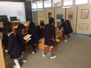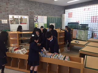 3学期の学校の本屋さんです。きれいに棚をふいて、本を並べて頑張っています。