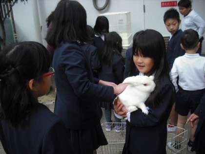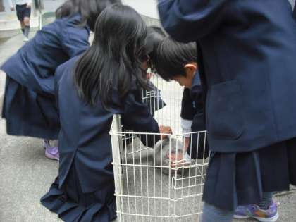 校内で飼育している2羽のうさぎ、「ラビ」と「げんき」にうふれあえる絶好のチャンスということで、たくさんの子どもたちがウサギ小屋前に集まってきました。こわごわ撫でてみる子、大胆に抱っこしてみる子、飼育委員の6年生に話を聞く子。「ふわふわや〜。」「めっちゃかわいい〜」と口々に感想を述べていました。