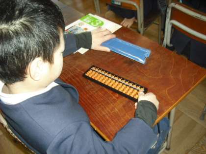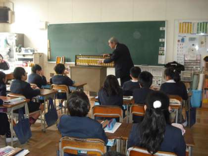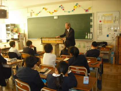 インフルエンザによる学年休業で延期になった、そろばん教室が開かれました。そろばんの歴史を聞きました。