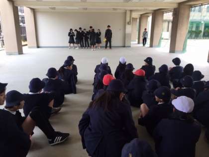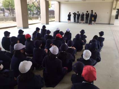 玉出中学校へ着きました。少し緊張気味の六年生です。