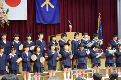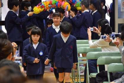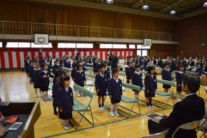 ピカピカの1年生33名が、6年生に手をつながれて入場しました。