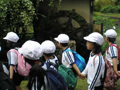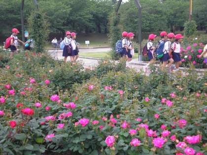 電車に乗る時も、バラ園を散歩する時も、手をつないで活動しました。