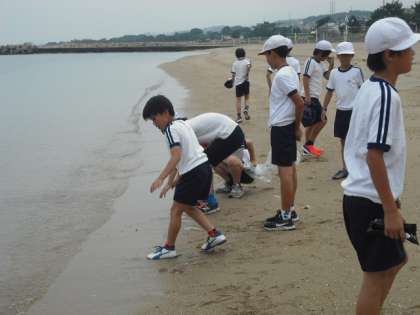 貝殻を集める児童、砂山を作る児童、生き物の観察をする児童。