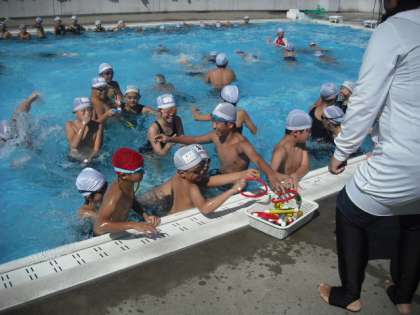 屋上プールでは、5、6年生の楽しそうな声が聞こえます。