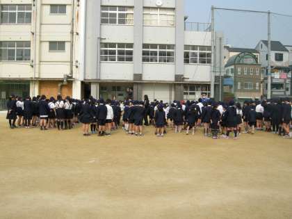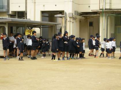 今日の児童集会は、3択クイズです。集会委員会の児童が考えた玉出小学校についての3択問題に全児童が答えます。みんな、それぞれの答えにむかって、楽しそうに運動場を走っていました。