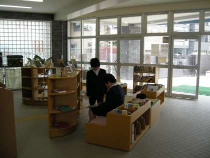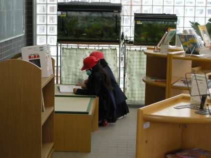 玄関の読書スポットには、休み時間になるといつも子供たちがきて、本を読んでいます。ふとあたたかさが感じられる風景です。本好きの子供たちがたくさん増えますように。地域の皆様、保護者の皆様もどうぞお気軽にお越しください。絵本って結構楽しめますよ。