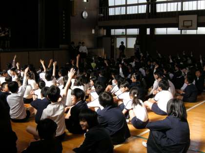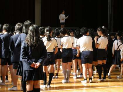 毎週木曜日は、児童集会です。みんなで「静かをつくる」ことを大切にしています。だから集会委員会も「たての列をそろえましょう」「静かをみんなでつくりましょう」「集会を始める心の準備をしましょう」と声をかけます。今日は、3人がマイクで一斉に声をだし、何を言っているかをあてるゲームでした。講堂中にあててほしくてたまらない元気のよい声が響きわたりました。